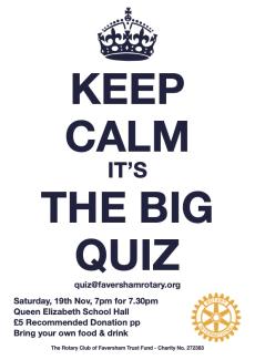 The BIG Quiz held on Saturday the 19th November at Queen Elizabeth School Assembly Hall, was a great success. A huge thank you to all those who supported the quiz to help us raise the funds that enable the Rotary Club of Faversham to support local good causes, such as Faversham Young Carers, Age UK, Faversham Christmas Lights, Youth Leadership Awards, Lend With Care and many more.