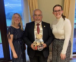 Karen Jeal and Lauren Clark, pictured with club President David Kirsch-Mills holding Basil Bear the Strode Park mascot, spoke about the work of the Foundation and its activities.