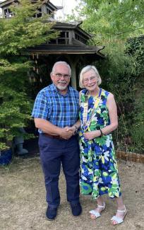 At a garden party on a delightful summer’s evening, outgoing President David Kirsch-Mills presented the chain of office to incoming President Clarissa Hanna.